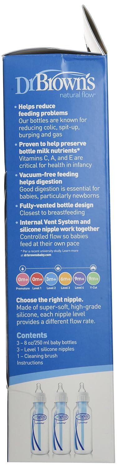 Dr. Brown's Natural Flow Anti-Colic Options+ Narrow Baby Bottle, 8 oz/250 mL, with Level 1 Slow Flow Nipples, 0m+, 4 Pack